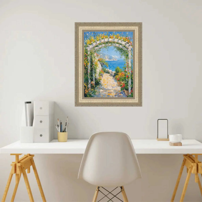 - Custom Frame Design: Featuring a rounded beaded front profile, this custom frame is adorned with a luxurious, gold leaf finish, adding a touch of elegance to your decor.