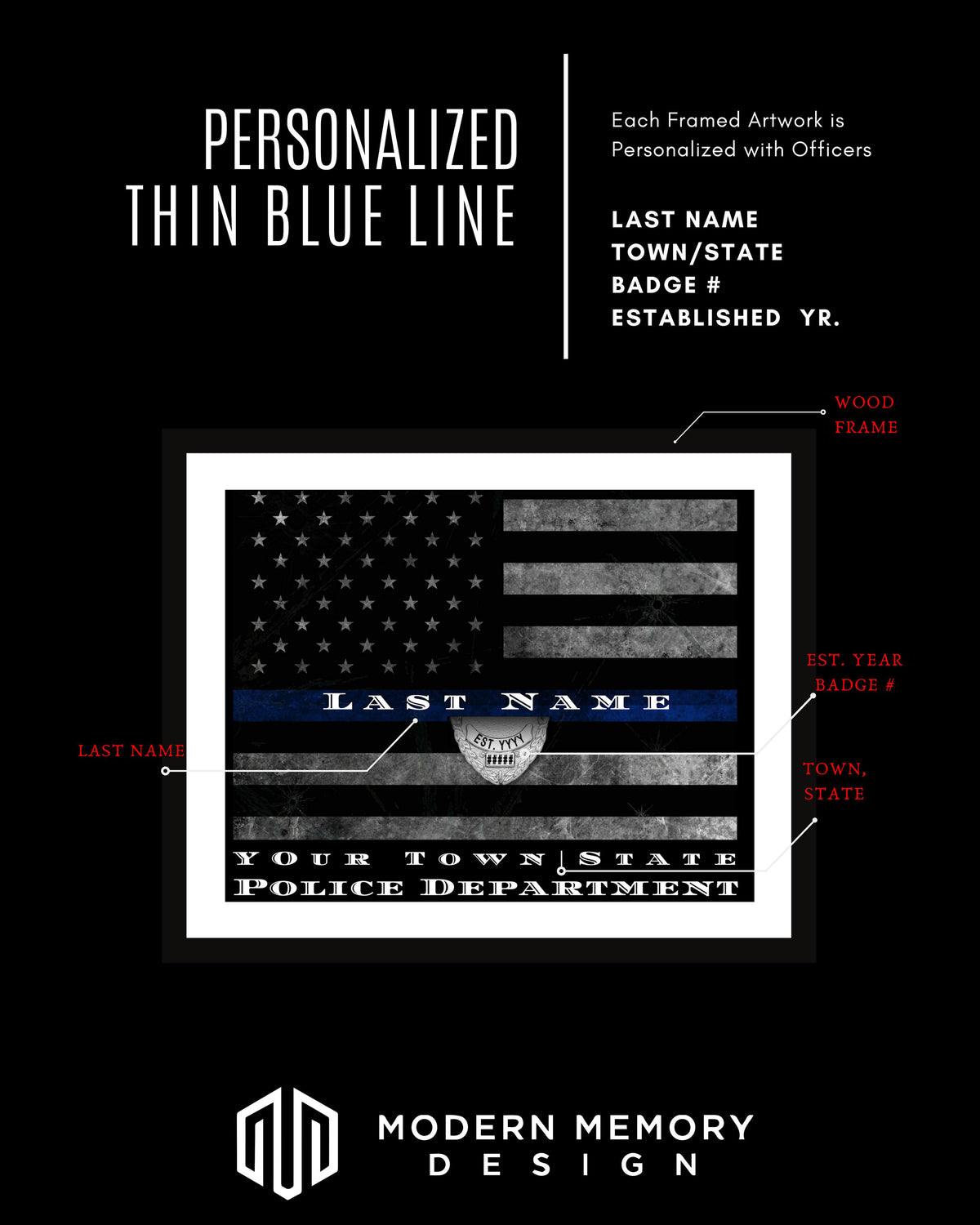 Crafted to last a lifetime, this personalized artwork features an 8x10 flag, beautifully matted and framed to an overall size of 11x14. Each flag can be customized to showcase important details, including the officer's last name, established start year, badge number, and city and state.