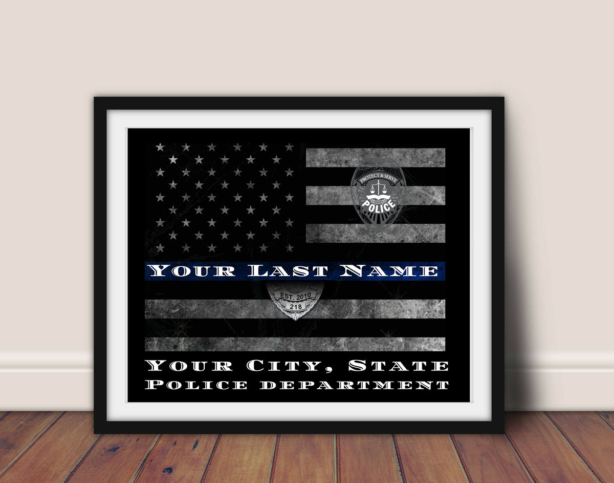 This custom gift for police officers features a beautiful blue thin line flag art print, prominently displaying the officer's last name and the established year of their career. Enhance your home decor with this meaningful tribute to those who serve and protect.