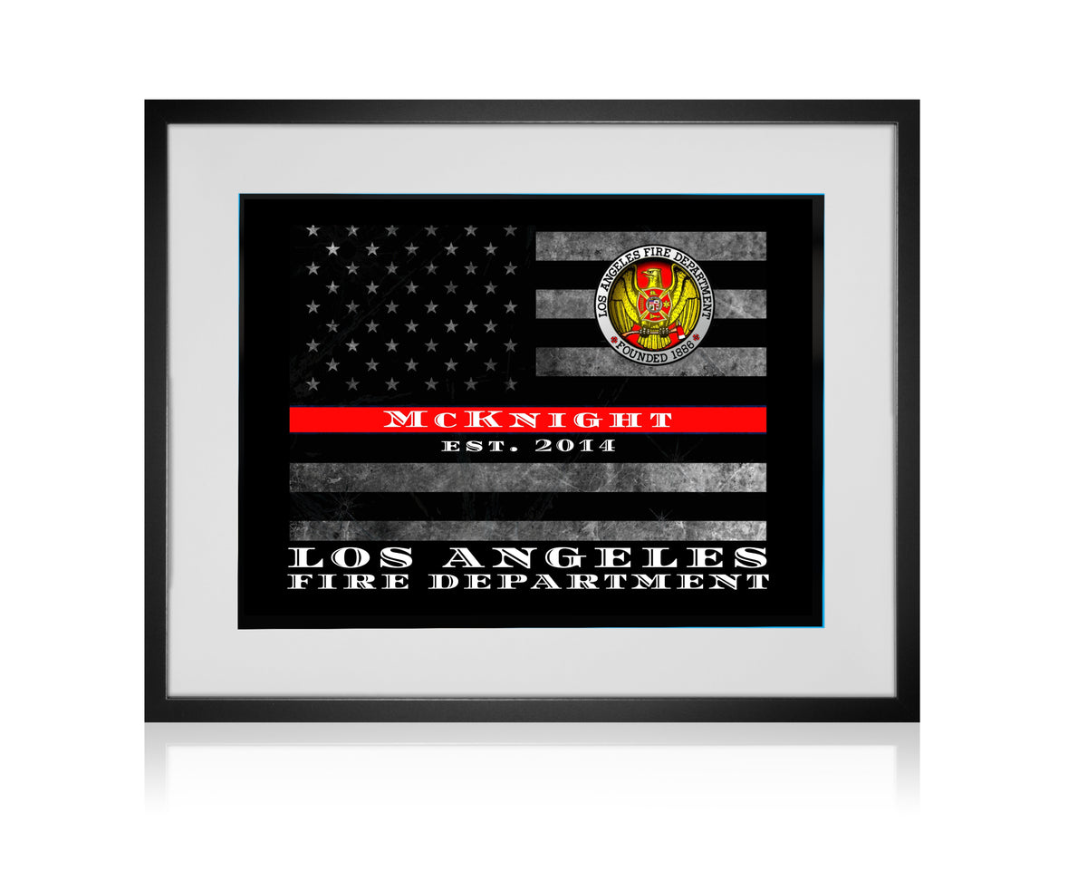 The Thin Red Line Flag, customized for the Los Angeles Fire Department, serves as a heartfelt tribute to firefighters. This personalized artwork is designed to enhance your home decor while honoring the bravery and dedication of those who serve. Available in both framed and canvas options, this piece will stand the test of time, making it a lasting addition to your wall art collection.