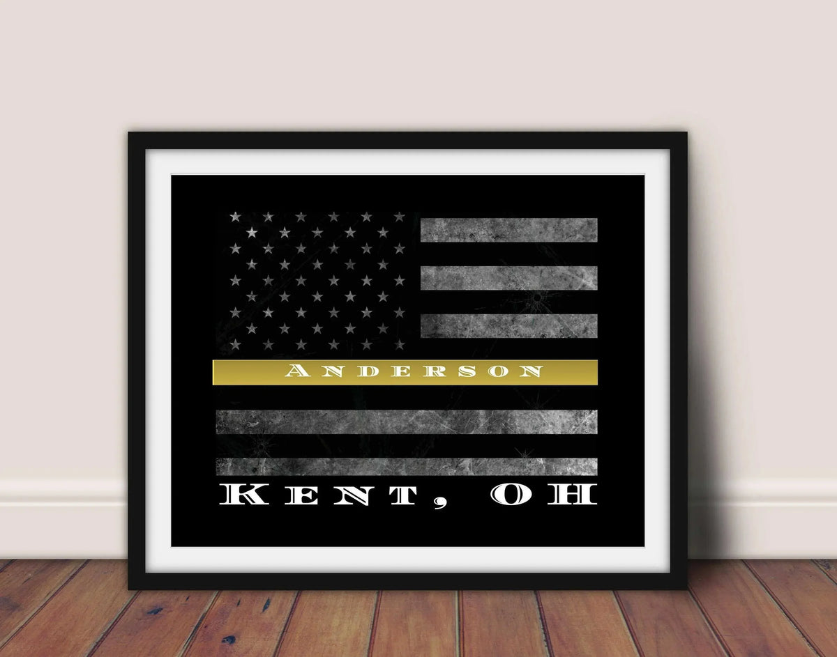 Introducing our Thin Yellow Line flag wall art, personalized with your last name and the year you began your service. This framed artwork will be a striking addition to your home decor, showcasing your unique taste and honoring your commitment. It serves as a meaningful display for friends and family to admire, making it a perfect way to incorporate personal elements into your living space.