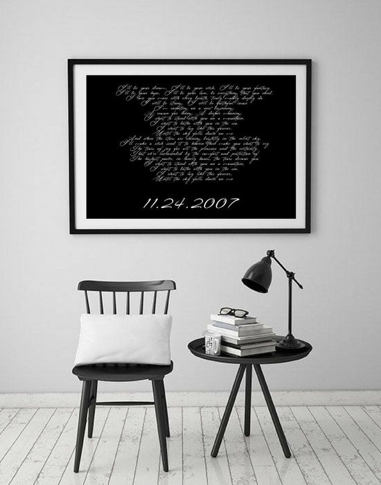 Feel the warmth and sentimentality this unique wedding anniversary gift brings into your home. Let it serve as a daily reminder of the deep connection you share, sparking loving memories and heartfelt conversations whenever you see it. The emotional impact of seeing your custom song lyrics featured in professionally crafted artwork is a lasting joy that never fades.