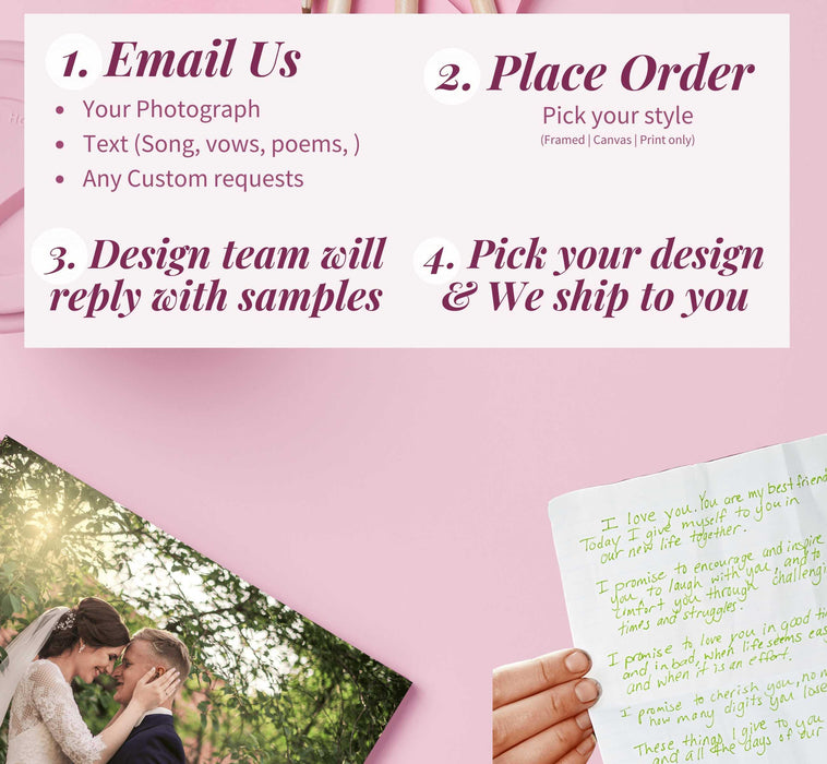 Beyond its beauty and sentimentality, this personalized wall art offers exceptional quality and longevity. Crafted with attention to detail in New Jersey, each piece is custom-designed to suit your taste, using your favorite photo, a special quote, wedding song lyrics, or any meaningful text you provide.